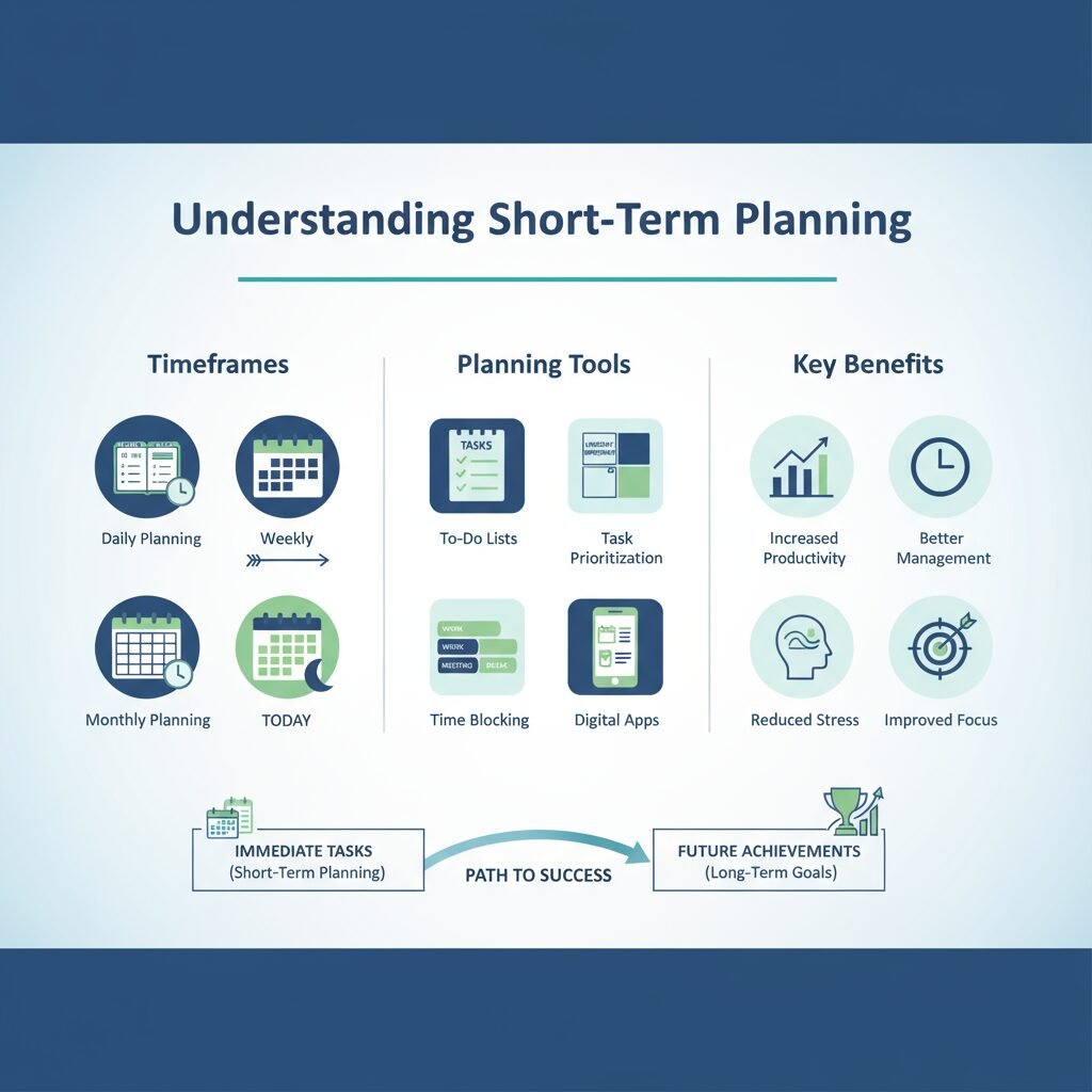 Short-term planning focuses on tasks, projects, and goals that can be completed in days, weeks, or months. It is immediate, measurable, and aimed at results.
